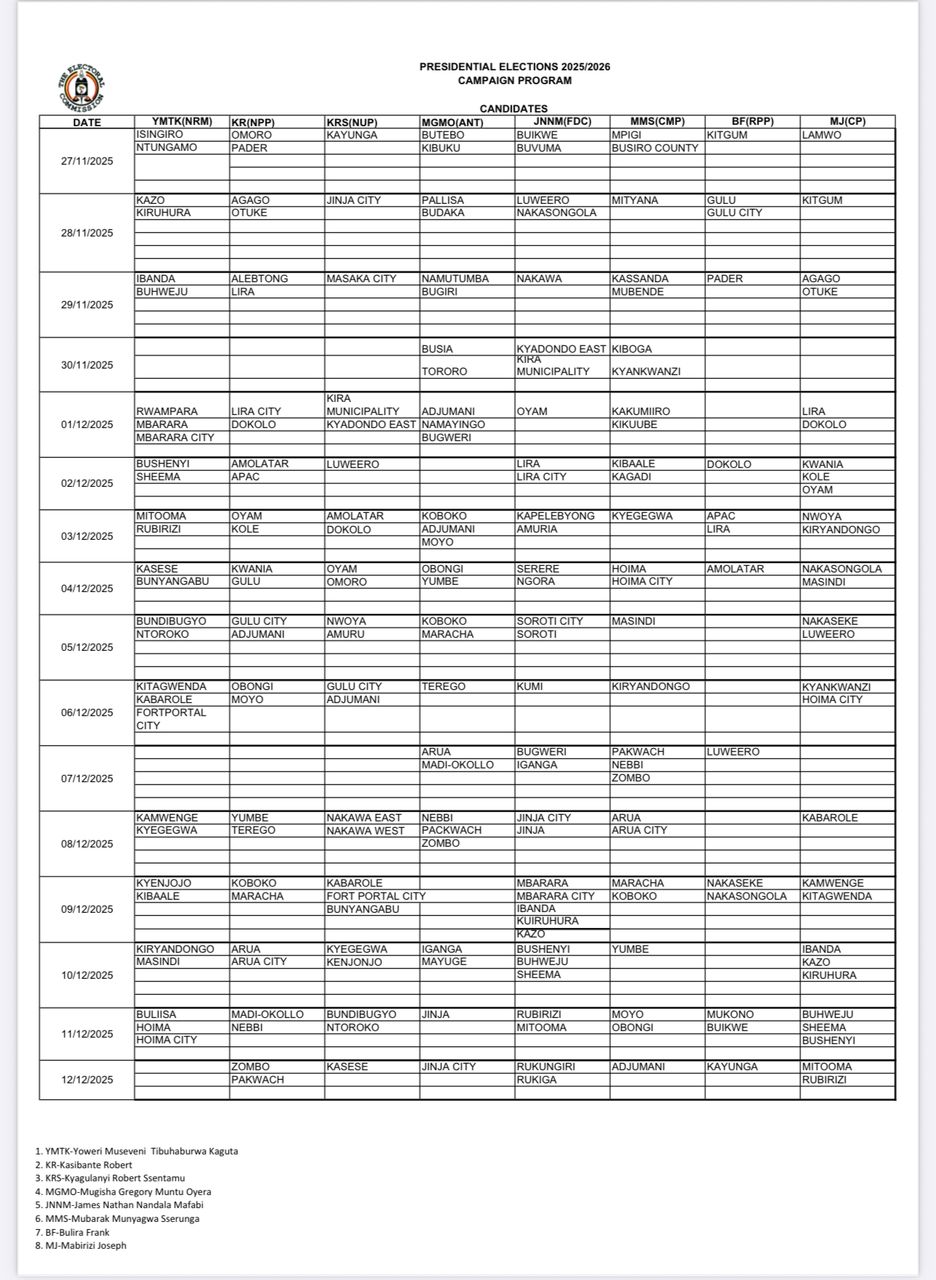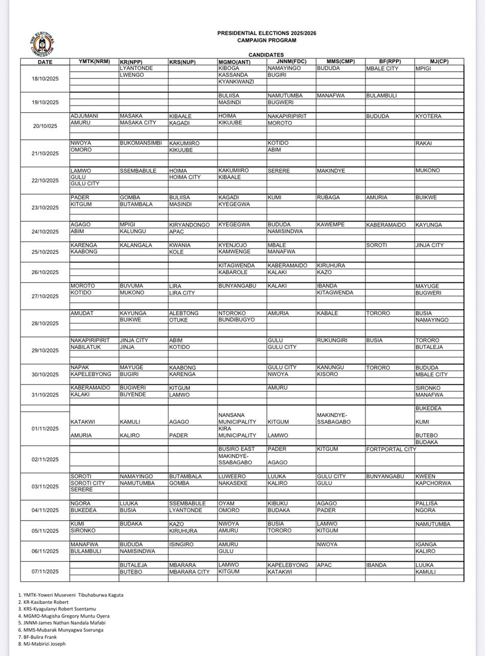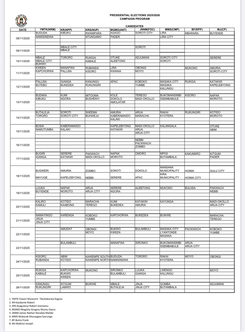 Kampala, Uganda – The Electoral Commission (EC) has released the harmonized campaign program for all presidential candidates, marking a crucial milestone on the road to the 2026 General Election. This follows the successful conclusion of the Presidential Nomination exercise held on September 23 and 24, 2025, where candidates were duly nominated in accordance with Section 4 of the Presidential Elections Act, 2005 (as amended).